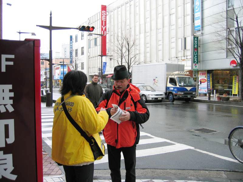 闭幕式是下午,上午法轮功学员们在繁华街发资料。学员碰到一位日本人,是大家在发资料的那栋楼的老板之一,很健谈。拿了资料看了一眼就讲起他对中国的一些看法。学员给他讲真象,他听后很吃惊,因为与他了解的情况出入较大,但显然他更愿意相信学员所讲的。聊了2个多小时,当学员表示,我们来这里讲真象就是为了使对法轮功的迫害早日停止,我们并不是为了钱才来在这里,甚至连这些资料都是我们自费印的时,他不由得掏出钱包要给学员钱。学员明确的告诉他:我不要钱,如果你要帮我们,就把这迫害真象告诉更多人吧。他欣然答应了。他说:“我发现你们是一群不一样的中国人,太高尚了。”由于他还要去参加闭幕式,没法细聊,他特地留了名片,还索要学员的名片,表示以后有机会一定要详谈。