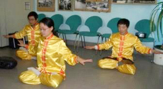当来自非洲的鼓手们表演完他们热闹的节目后,身着黄色炼功服的法轮功学员们走上舞台,伴随着舒缓的音乐和优美的炼功动作,讲解的学员向观众们介绍了法轮功的洪传过程,和当今在中国所遭受的无理迫害以及功法本身的特点。