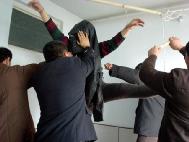 恶警李卓阻止家属和同修给我们送饭,还威胁说:再不走连你们也抓起来!李卓不让我方便,又不让我喝水,在我强烈要求下,15日晚只让我方便一次,回来就吊上,到了零点以后,因我被吊铐在铁环上,有摩擦声,恶警李卓不让我出声,说有响声他睡不着觉,我说:你这么吊着我能没有响声吗?他只好将我放下,让我躺在水泥地上,呈大字型手脚都被绑住不能动。16日早刚5点钟又将我吊起来,直到8点才放一次便,整个一白天,不让喝水進食,不许方便,后来被吊得小便失禁,都便在裤子上了,顺着脚往下淌,直到晚上18点,要将我和妻子送看守所这才把我放下来,当时我的左腿膝盖以下完全失去知觉,不能动也站不起来,双手腕被手铐勒得鲜血淋淋。给我们送到看守所时,是我妻子搀着進的监室。