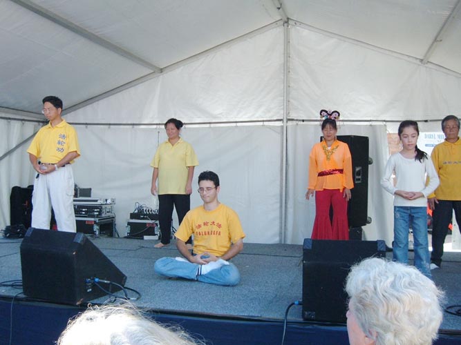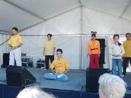 活动组织者安排给法轮功学员两次短时间的表演,一个是传统中国舞蹈, 展示了富有特色的美丽装束和中国乐器,另一个是功法示范。两次表演都引起观众们饶有兴趣的观看,并为法轮大法的祥和及纯正的场所感动。
