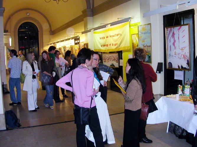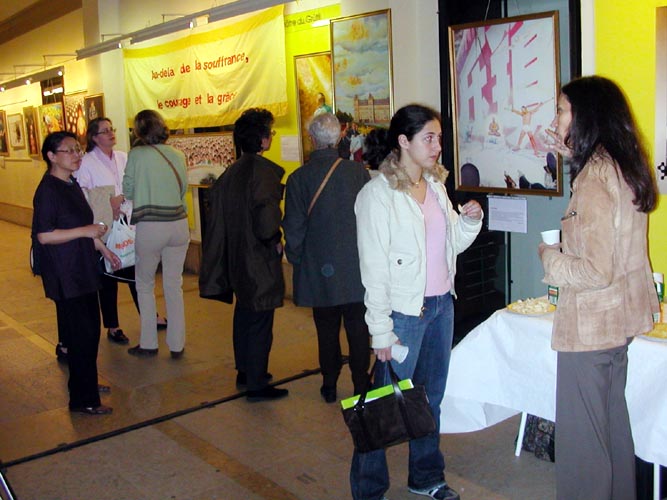 画展大厅中,许多观众仔细观赏每一幅作品,并与在场的法轮功学员深入交谈。一位参观者说,他能感受到这些画作的巨大力量,并希望这些绘画作品能在日内瓦和瑞士更多的地方展出。许多观众说,虽然他们知道法轮功在中国被镇压,但没想到会这样野蛮,残酷!通过参观画展,他们明白了真象,对这场不该发生的悲剧及中国××党的专制政权有了更具体、深刻的认识。他们对在21世纪的今天发生这样的悲剧感到惊讶,并纷纷签名,呼吁停止这场已持续了五年多的荒唐镇压。有的观众还特意要了空白签名表,表示要帮助法轮功学员征集更多的签名,让更多的人知道真象。