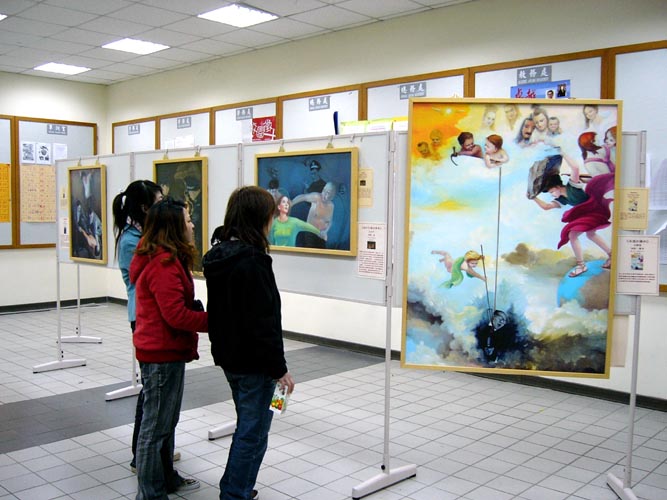 展出的第一天,就吸引了许多学生前来观赏,许多同学都被画作所表现的精神所震撼,有的人不禁说:“画得真是太好了!”有些同学觉得这些画作给人的感觉很不一样,虽然自己不是专业的美术家,但是可以感觉画里表达了一种无法言喻的精神,当明白了画中法轮功修炼者被迫害的事竟发生在现今自由的社会,许多同学不敢置信,很多人第一句话就是:“太令人震惊了!”很多同学也十分支持这样的画展能继续办下去,让中共的恶行曝光,使更多人知道。