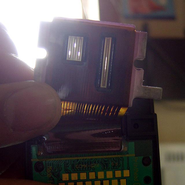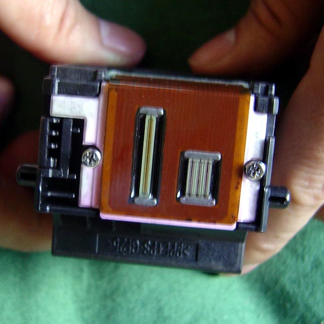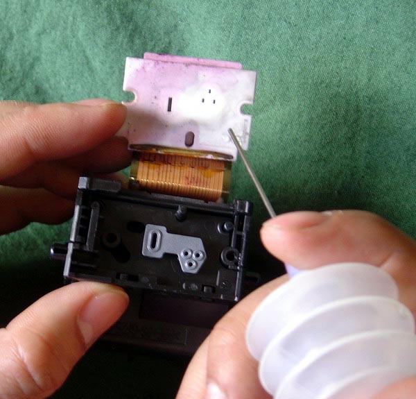 由于严重堵头,用了各种办法都无济于事。同修说见过明慧文章讲可以把打印头的螺丝拧开把整个打印头完全浸泡在酒精里。所以试着拧开螺丝拆开打印头(见图一),发现打印头是一张带喷嘴的电路板粘在一块类似陶瓷的板子上,有一个长孔(黑色喷墨孔)和三个小孔(彩色喷墨孔)。遂拿了一个如图二所示的空的塑料墨水瓶,也可以拿个注射器,装上清水对准各个喷墨孔使劲冲洗,几分钟就把喷嘴冲开了,见图三和图四。另外也要把如图二所示在墨盒上的四个孔也冲洗一下。注意图四下部的电路板要完全干燥后方可上机器工作。最好晾上一小时后再安装。