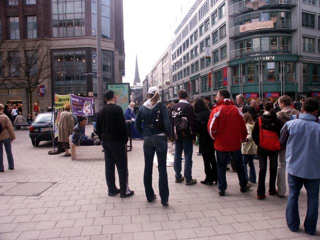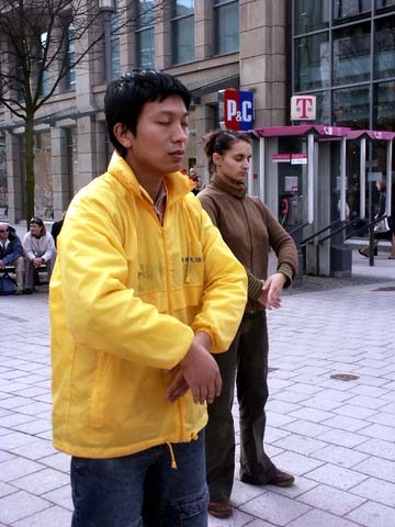 以前我们举行信息咨询活动时常常出现一些干扰,今天却一帆风顺:我们介绍法轮功和揭露迫害的传单发得很快。一个德国社会工作者Christin充满敬意的问我:我是否可以和您的同事握一握手?