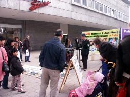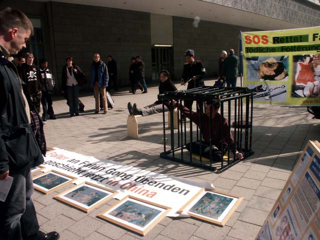 这是德国法轮功学员举办的一个信息展位,他们希望以此来唤起人们关注对在中国正发生的、对和他们一样的修炼人的镇压和残酷迫害,这场迫害已经持续近6年了。冲破重重信息封锁透露出来的消息证实,已有超过1600个无辜法轮功学员被迫害致死。