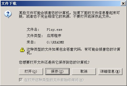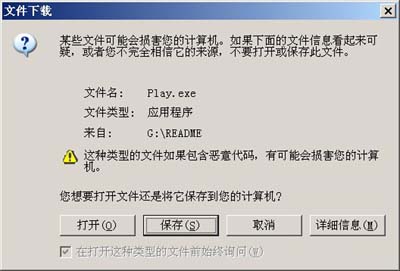 本方法的一个缺点是:由于9PTVrm.htm文件的超链接直接指向EXE文件,IE基于安全性考虑将进行提示,此时点击“打开”按钮即可。如下图所示。
