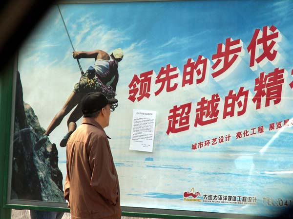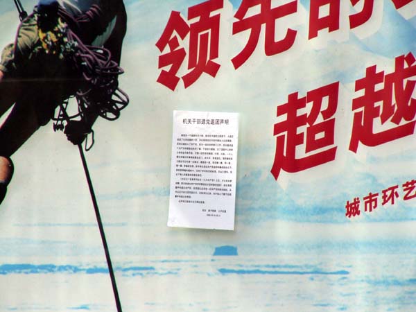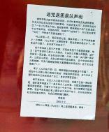 此前笔者的朋友曾告诉过我在某处也贴有一份这样的声明,是红字标题,黑字正文,可当笔者赶到那里的时候,声明已经被人撕掉了,可见中共还是很怕这种声明让老百姓知道的。