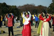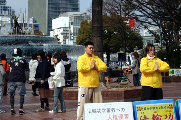 学员在洪法炼功,背景的日本年轻人在演奏摇滚乐,学员闹中取静。(3月25日)