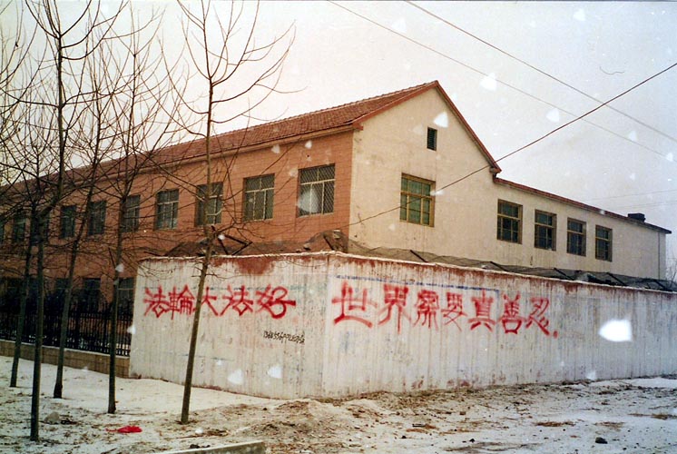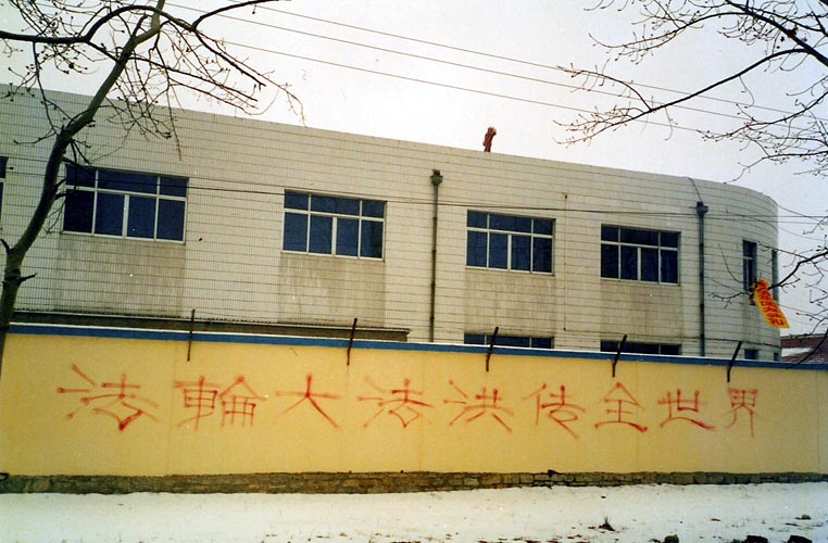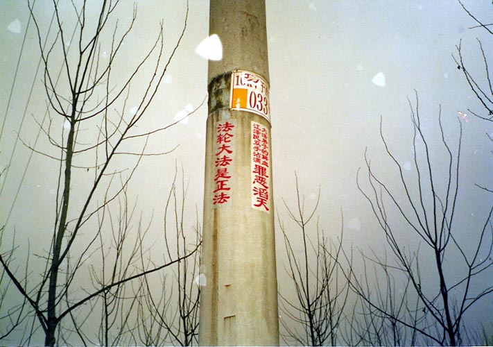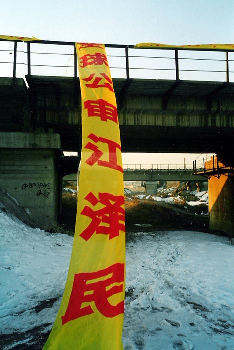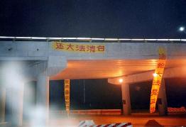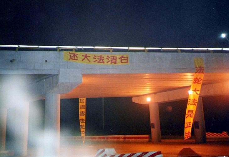 【明慧网2005年3月31日】图为山东潍坊大法弟子挂出的真象标语和条幅。