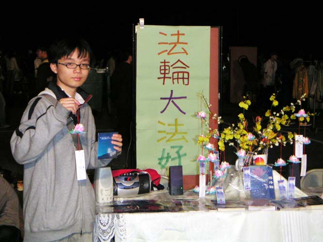 除了漂亮的莲花书签吊饰和法轮功学员创作的音乐“请与我比邻而坐”外,洪法摊位也提供一些免费的资料、书签、光碟。除了《转法轮》之外,同时也有放一些其他的书如法轮功学员写的《为你而来》等。整个摊位非常的精致亮眼。