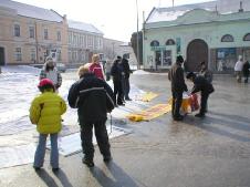 【明慧网2005年3月7日】2005年3月5日,法轮功学员们来到了位于斯洛伐克西部的Hlohovec市,向这里的人们介绍发生在中国已持续了近六年的对法轮功的残酷。正值严冬季节,但很快太阳出来了,温暖的阳光照耀着展示功法和讲真象的学员们。当地的民众也对法轮功学员表达了他们的热情欢迎和关心。