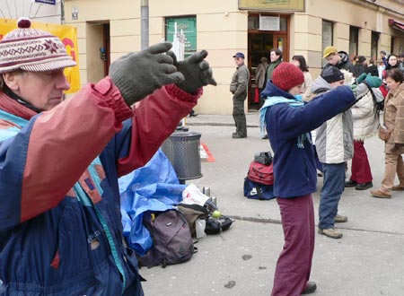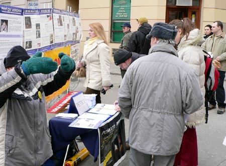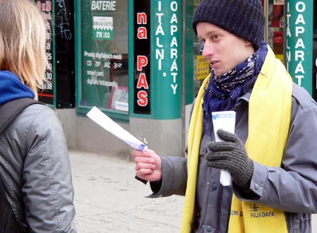 【明慧网2005年3月7日】2005年2月25日,捷克法轮功学员相聚于莫阿维安地区(Moravian)的首府布诺市(Brno),向人们讲述发生在中国的对法轮功学员的。在这场已历时近六年的迫害中,经证实,已有超过1400位善良无辜的法轮功学员被迫害致死。