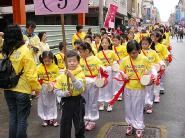 气势轩昂,让人精神振奋的腰鼓队深受欢迎,铿锵有力的腰鼓声响彻云霄,震撼人心,唤醒人们的善念。队伍经过时,路边挤满的观众不时报以热烈的掌声。穿梭在游行队伍两边的学员则忙不迭的分发法轮功真象资料给观众。