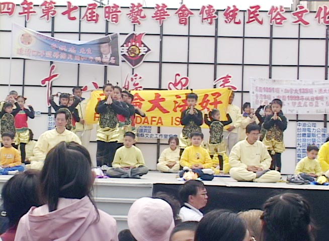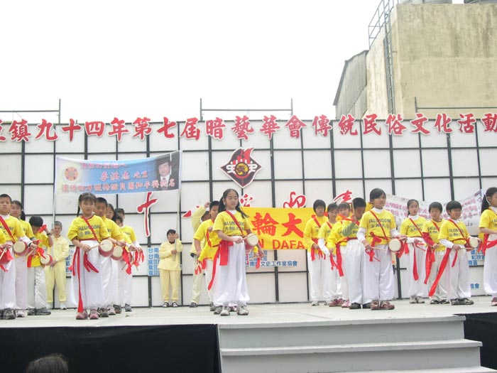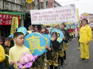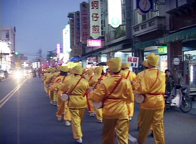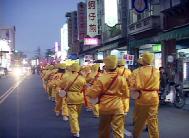 晚上六时展开的艺阵踩街,有多达三十二个单位参加游行,由来自台湾南部的高雄、台南、麻豆、新营等地区的法轮功学员组成的游行队伍在小镇上显得特别壮观盛大,游行队伍中法轮大法好的旗帜鲜明醒目,世界各国的褒奖和大法洪传的横幅搭配真象材料的派发,起到了很好的洪法效果。