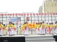 经过几条大街后,各队伍齐聚主舞台前参加民艺华会开幕式。七时三十分,各文、武阵头登台拼艺竞技,再现第二波高潮,鸣锣响鼓将持续至半夜才落幕。腰鼓队在“法轮大法好”音乐的伴奏下,迈着整齐的步伐,舞动着鼓槌,鼓钹声声,传递“真善忍”的福音。