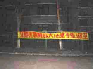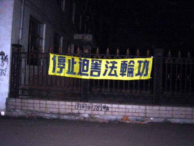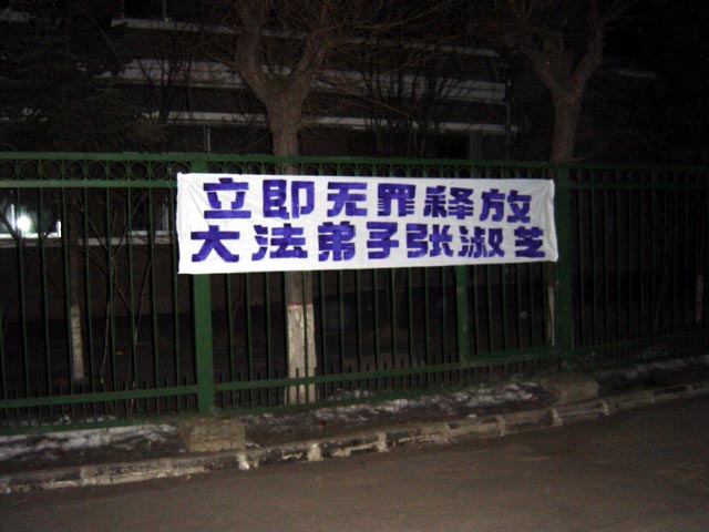 在得知大法弟子张淑芝被尚志市法院非法秘密判刑的消息后,大法弟子一行人于3月25日连夜赶到尚志市,将小册子《紧急营救张淑芝》、公告《立即无罪释放大法弟子张淑芝》及《上诉状》撒遍尚志市的大街小巷,并将“立即无罪释放大法弟子张淑芝”、“停止非法秘密审判大法弟子”、“停止迫害法轮功”“还司法公正、还司法尊严、还人民信仰自由”等大条幅悬挂在尚志市公安局的围墙上,悬挂在检察院、法院和市政府附近的铁栅栏围墙上,有力的震慑了邪恶。