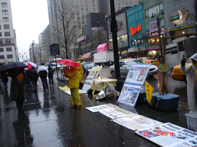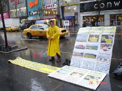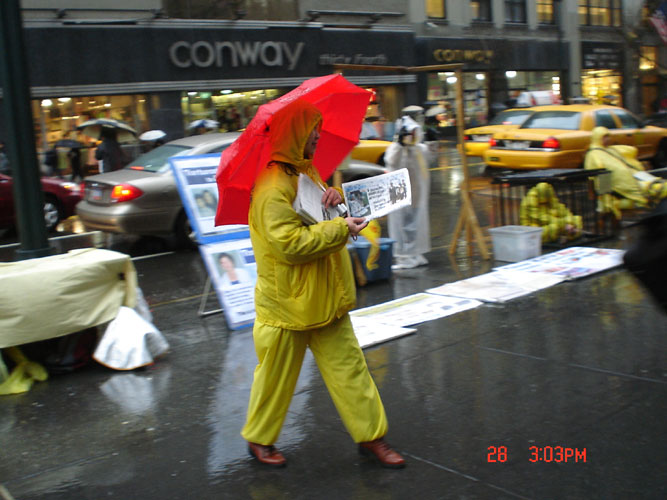 【明慧网2005年4月1日】在纽约曼哈顿讲法轮功真象的活动已经持续半年多了,从酷暑到严冬,无论什么样恶劣的天气都挡不住法轮功学员们的努力。怀着让更多人了解真象的真诚愿望,他们在风雨中坚持着……