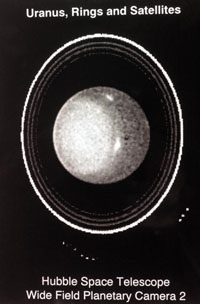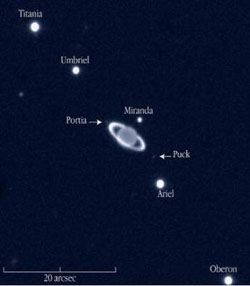 欧洲天文学家利用架设在智利的ANTU望远镜拍摄到一幅天王星(中心的大星)独特照片,照片是用近红外波段(波长为2.2微米)拍摄的,在照片上可以清楚地看到天王星的光环及其7颗卫星。