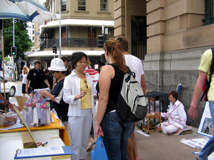有一位老年妇女一边仔细的阅读真象图片的文字说明,一边擦着眼泪喃喃的说;“为什么?为什么?这还有天理吗?”学员给她解答了她的“为什么”之后,她明白了真象。签了名后,她还想要张签名表回去让她的家人和朋友签。她说:“我相信,我把你们被迫害的情况告诉他们后,他们也一定像我一样毫不犹豫的签名的。”