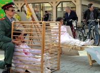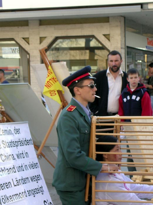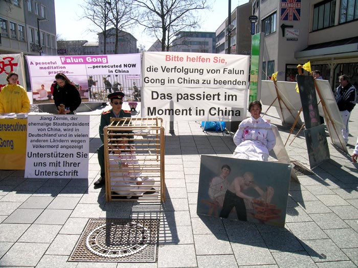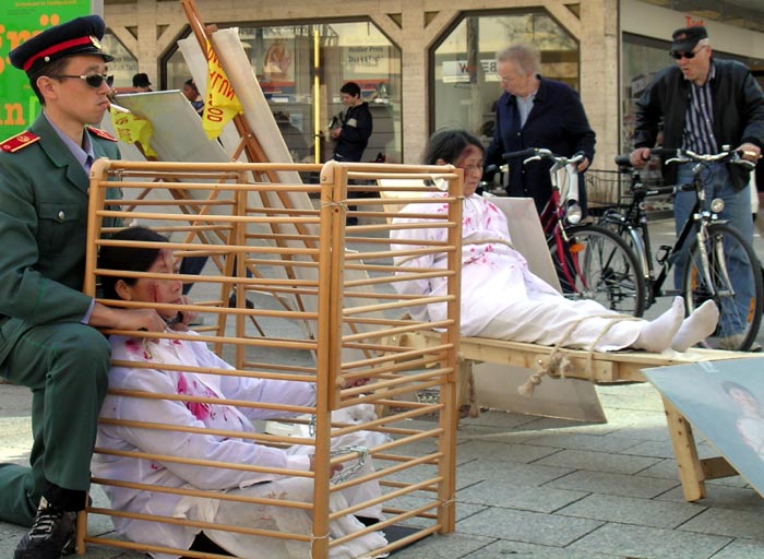 星期六的天气非常好,行人徒步区里到处都是人。法轮功学员们在展位的一边展示功法,另一边模拟大陆学员受酷刑的场景。路人读了横幅与海报,特别是酷刑的场面引起人们极大的关注。很多人不能理解,为什么在今天这个年代还会发生这么残酷的事情。他们以签名的方式支援审判江泽民。
