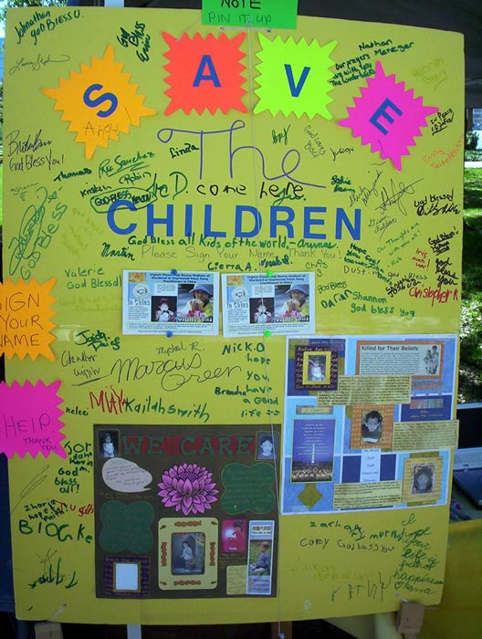 法轮功学员们在这次活动中提醒人们关注这些不幸的小孩,他们的父母因修炼法轮功而在中国江氏集团的迫害下被迫离家、遭监禁、遭虐待,甚至遭到谋杀,许多小孩被退学、被打,甚至被虐待,只因江氏集团不能容忍他们或他们的家人炼法轮功。