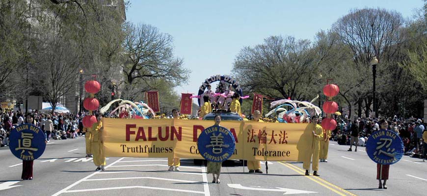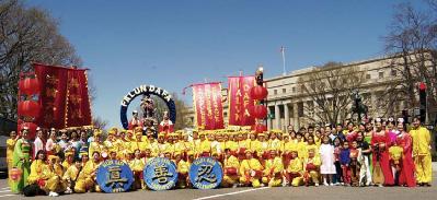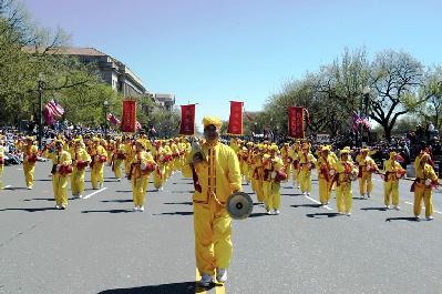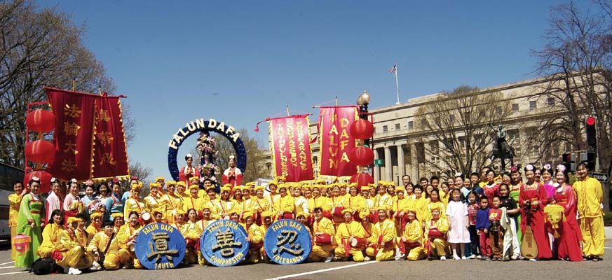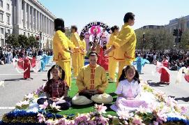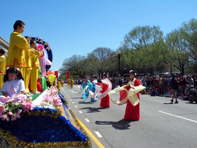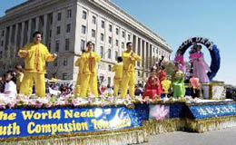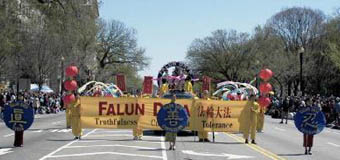 法轮功学员的队伍在整个游行中被排在第99号。三名身着中国传统旗袍的女学员手持“真”,“善”,“忍”的匾牌走在队伍的最前面,紧随其后的是印有英文“法轮大法”的巨大横幅,八位“仙女”手持彩带飘逸在花车两侧,花车上中西方法轮功学员向观众演示着缓慢、舒展、祥和的法轮功功法。花车后面是由纽约、新泽西和费城的学员组成的腰鼓队,浩浩荡荡,气势磅礴。