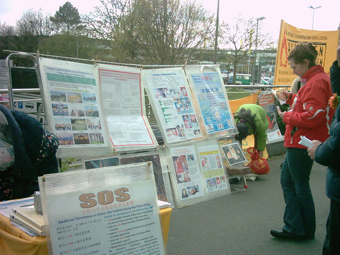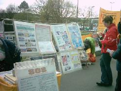 四月九日下午两点,到多特蒙德市(Dortmund)参加社民党(SPD)竞选活动的人们一出车站第一眼看到的就是法轮功学员布置的大型展板和横幅,大号字体SOS让很多人放慢脚步看个究竟。当他们最终停下脚步仔细观看展板上的图片时,他们不得不震惊于强烈的对比,一边是平和的炼功图片,一边是被迫害得遍体鳞伤的法轮功学员。很多人接受了传单与学员们精心准备的纸折小莲花。