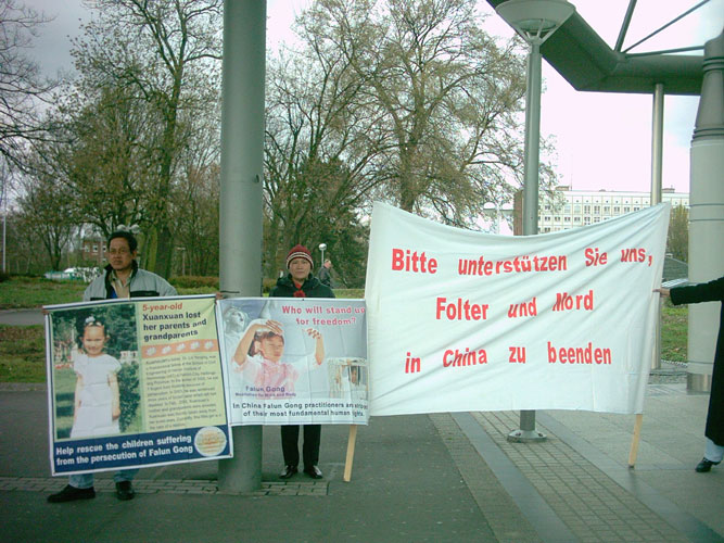 【明慧网2005年4月14日】二零零五年四月九日,德国鲁尔(Ruhr)区法轮功学员在德国社民党(SPD)竞选活动中当面呈交德国总理施罗德(Schroeder)一封呼吁信,呼吁德国政府关注上个月因申请难民被拒而被送回中国的法轮功学员姜仁政、郭蕊夫妇及他们的两个不满三岁的孩子。姜仁政于四月八日被警察从沈阳他妻子的父母家带走,次日被判三年劳教,目前关押在辽宁本溪市劳教所。