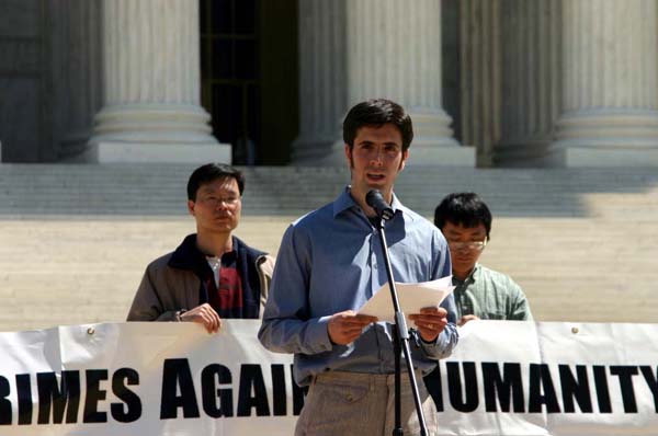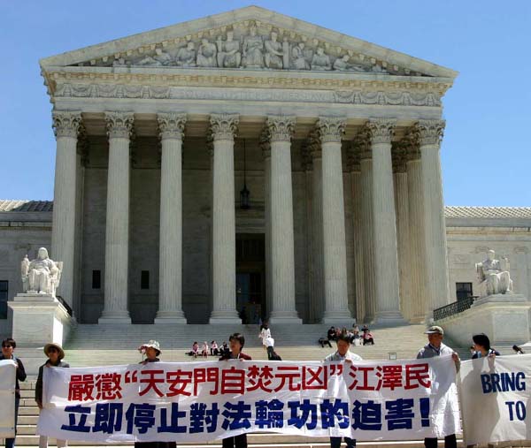 法轮功学员在最高法院前打出写有“停止侵犯人权,法办中国独裁者江泽民”、“杀害及监禁无辜万千 江泽民犯群体灭绝罪被起诉”、“法办江泽民”、“停止在中国(对法轮功)的群体灭绝!”等中英文横幅。