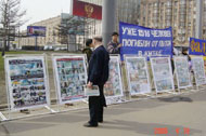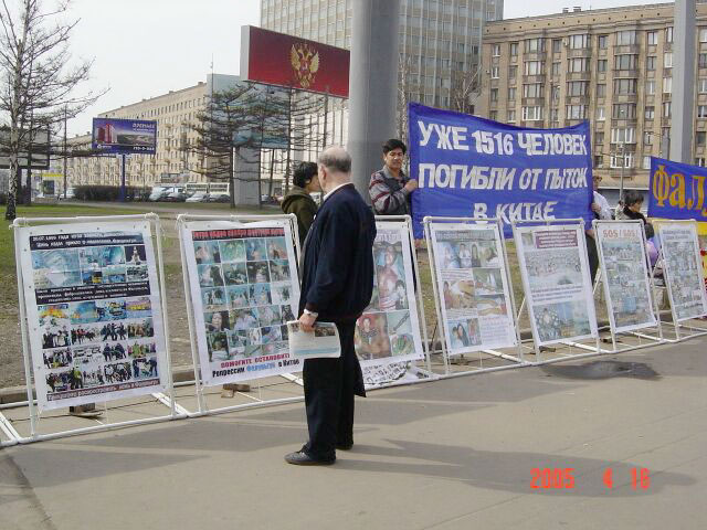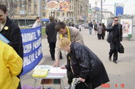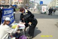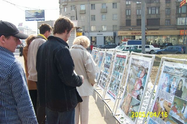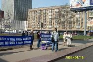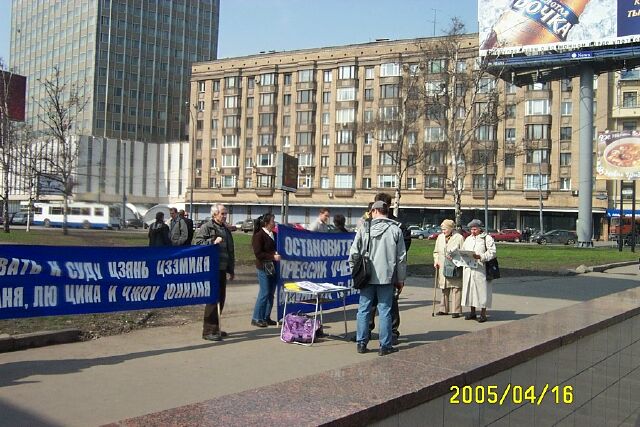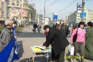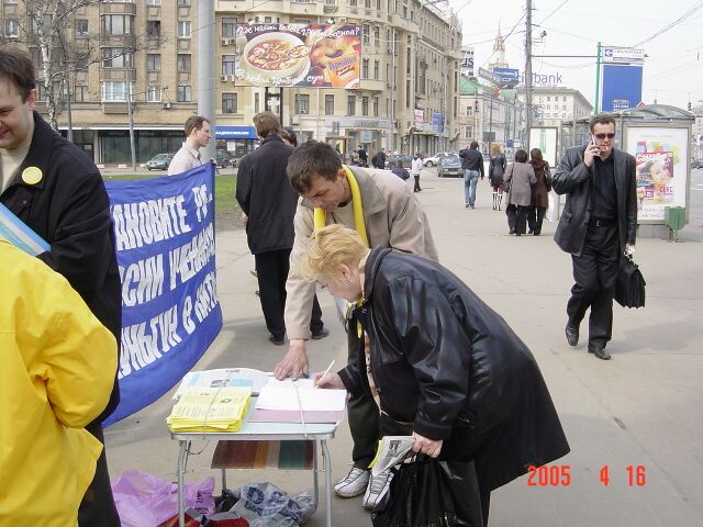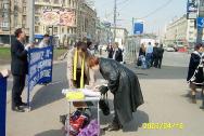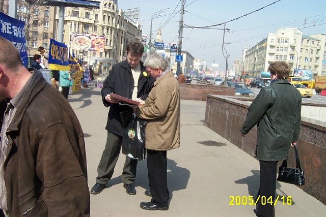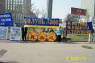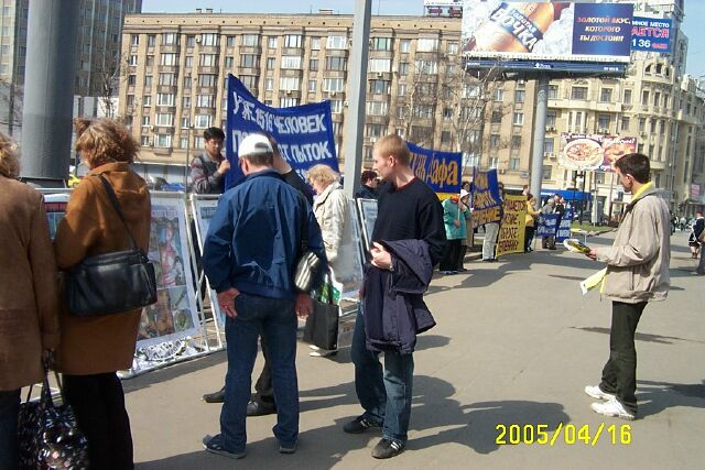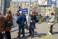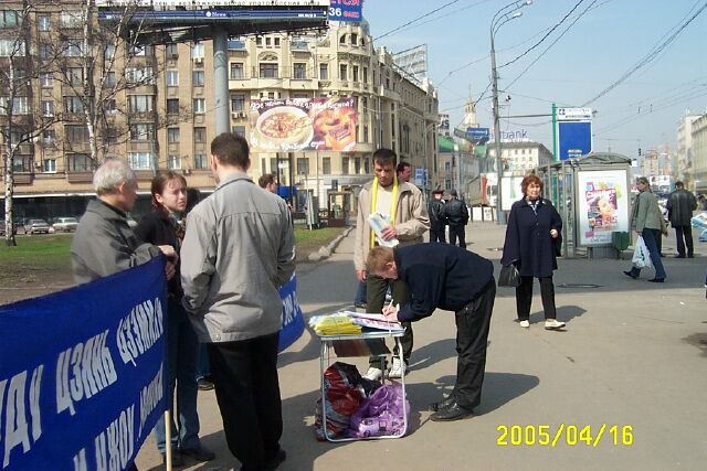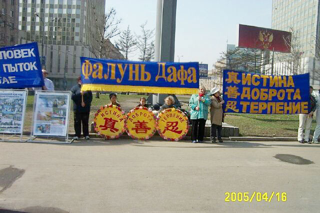 【明慧网2005年4月18日】2005年4月16日(星期六),莫斯科法轮大法学员在俄罗斯外交部大楼马路对面、斯摩棱斯克广场讲真象,呼吁停止在中国对法轮功学员的