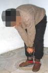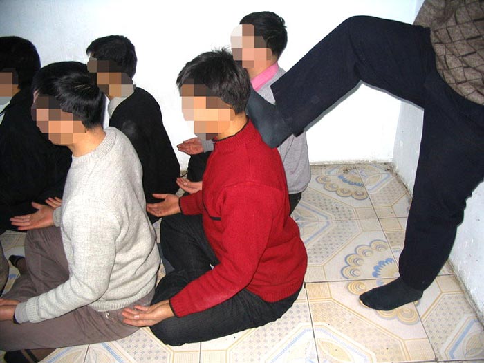 2000年10月强迫大法弟子两手放在膝盖上,手心朝上、腰板挺直、一动不能动的整天坐着。稍有晃动就遭刑事犯人毒打、脚踹。。(演示图1、2)