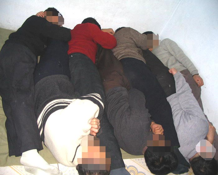 2000年10月对非法关押大法弟子,每人只给10多公分的睡觉地方。每个睡鱼的人头抱着脚,紧紧贴在一起,连喘气都困难。(演示图3)