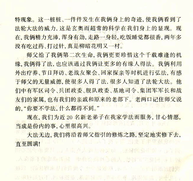 师父给了我俩第二次生命,我俩更要珍惜这个千载难逢的机缘。我俩得了法,也应该通过我俩让更多的有缘人得法。我俩利用外出疗养、节日拜访、老战友聚会、回家探亲等时机进行洪法。有感于师父的无量威德,使很多人得了法,很多人知道了法轮大法。他们中有军区司令、兵团政委、舰队政委、基地司令、集团军军长和战友们的家属,也有我们的亲戚和原来的老部下。