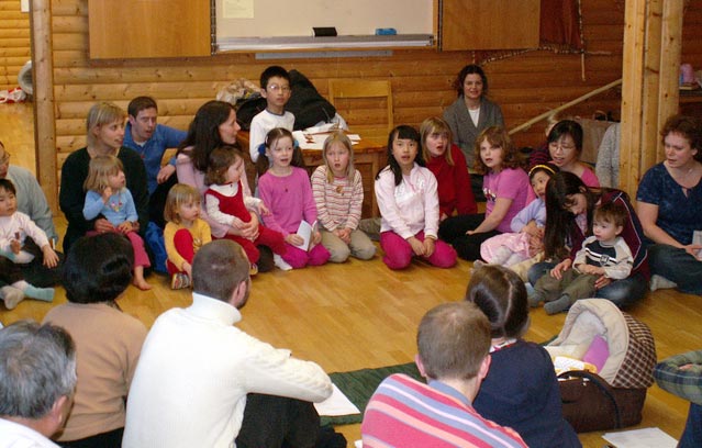 见到久违了的小朋友们,大家很开心。每天我们都用大约半小时,和大人们一起坐成一圈儿唱歌,读《洪吟》 。这是他们最喜欢的活动之一。由小宝宝们自己点歌儿,手舞足蹈的学着各种小动物,唱儿歌。大家最爱唱的歌是“法轮大法好”。小宝宝们都张开小嘴唱,还唱的挺认真。最小的宝宝不到两岁,还不怎么会说话,却会说“法轮大法好”。