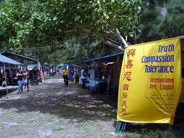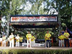 【明慧网2005年4月20日】塞班岛一年一度的火树节,于2005年4月15日到17日举行,台湾法轮功学员一行十一人前往参与该地学员的洪法活动。在密克罗海滩旁的大会场,塞班法轮功学员租了五个摊位,不仅最靠近舞台,也是所有参展单位中规模最大的。