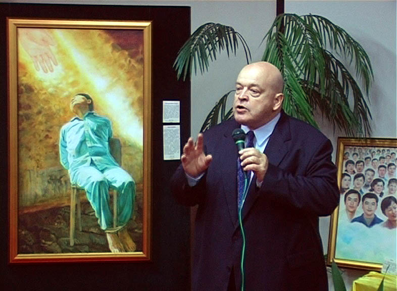 麦克•达比先生在致词中表示何华德总理访问中国不能只看中共的表面形式如何,而应看其本质,共产主义是邪恶的。他从这些作品中不仅仅看出天分和勇气,更看到了作品带给人们坚韧不屈的精神。他介绍其中有一幅描绘的是澳洲公民的丈夫为了追求自己的信仰而被中共迫害致死,他说:“在中国这样的悲剧每天都在发生。酷刑、绑架、打死、洗脑等等,在中共统治下的人们是控制不了这一悲剧的,然而通过这些可贵艺术家们的努力和支持及你们这些善良人们的帮助,我相信这一社会现状一定会改变的。我们也将期待中国成为一个自由民主和幸福的国家。”