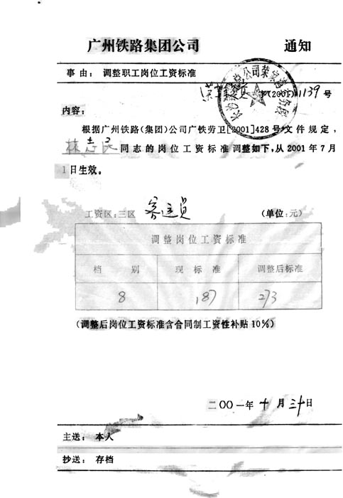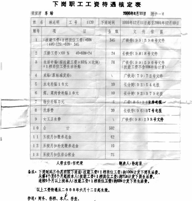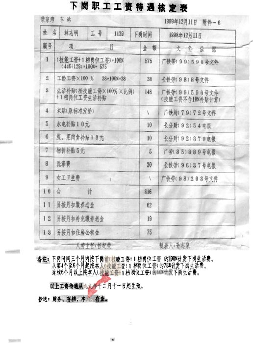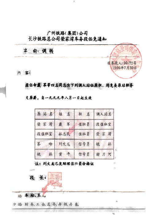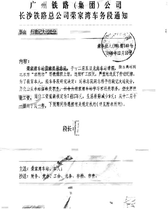 直到第二天17点多,不法人员对他进行简单的问话后,才放他出来,又送单位谈话。并通知他在家待令写“认识”。单位每天还派人到他家“谈话”、要材料,7月底通知他被调离车务段值班室,到荣家湾火车站报到,荣家湾王站长要他从8月2日当助理值班员的正班。8月2日早上点名时王站长通知他上面不同意他当正班,暂时在车站打杂,段领导张岳军说:车站对他要成立三人的“帮教”小组,每月要思想汇报,交段党委。王(义进)站长多次向段反映,要安排他当正班,段党委说:是长沙铁路总公司610办不同意。直到99年10月20日,林志明才当信号员的正班。