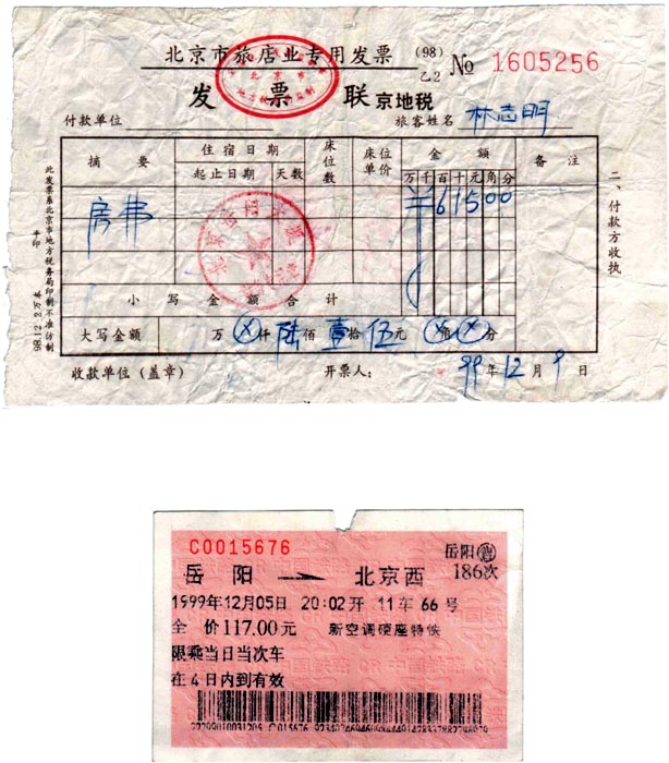12月8号这天,岳阳县民警刘X、荣家湾铁路派出所民警毛永球、尹永琦、荣家湾车务段领导张岳军到北京,张岳军要林志明打了一张欠条,说是交宾馆住宿、伙食、保安费共615元(住宿每晚140元、保安每天100元、伙食每餐5元),从工资中扣款,并开了一张北京市旅馆专用发票。