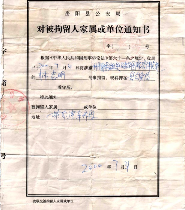2000年3月份开政协人大会议,不法人员又将林志明软禁半个月,非法关押在荣家湾车务段机关院内,派6人三班倒看守。2000年7月再次将他软禁在荣家湾段机关院内,派四人二班倒守着。7月底,铁路派出所民警毛永球将林志明骗到岳阳县公安局政保股后,直接将他送到岳阳县看守所,非法关了31天,并找他妻子勒索了2000元所谓罚款给岳阳县公安局,才放他出来上班。