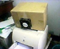 我处是北方某大城市,10公斤散装“希美格”碳粉(一箱分四小包)860元,HP7115与Canon ep25两种鼓完全一样,没灌过粉的二手HP7115鼓90元,耐用程度很高。鼓芯50元,Canon 1210 每台1450元。打印第2面时带纸的原因主要是静电大,解决办法是选用纯木浆纸,我用过亚龙系列的尖兵、旗兵、乐透等多种木浆纸,A型价格均为114(现价),且打完正面后多晾一会,晾后打另一面,如下图在纸上压一个宽胶带。这样几乎不带纸,我处的一老年女同修同时使用两台,打印时无需看机器,可做其他工作。降温办法是背后加抽风电扇,如下图:温度解决后可整天连续打印。风扇选220v 电流 0.18A即可,大概17元。USB打印电缆要买一个带磁环的,可防电磁干扰。个人体会,供同修参考。