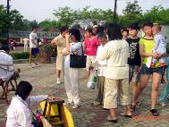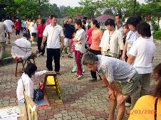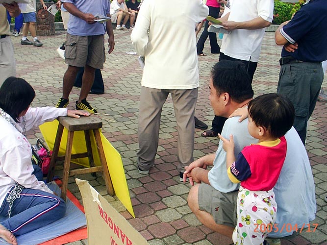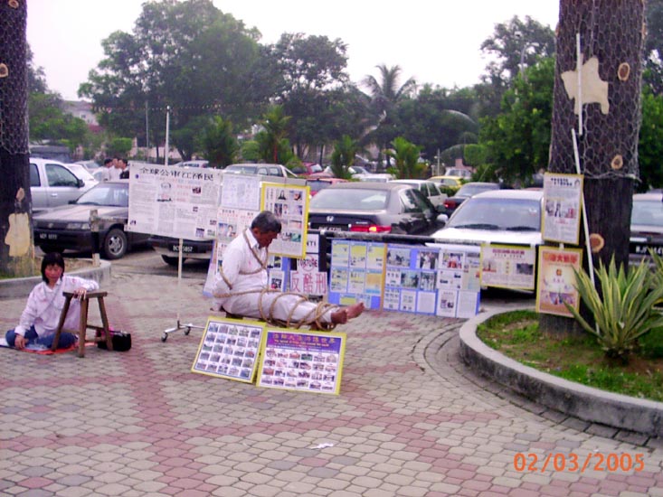 反酷刑展现场──于公园正门反酷刑展于2005年4月17日在该炼功点展开。学员在清晨很早就到达炼功点炼功,发正念,准备反酷刑展的事项。七点,天空渐亮,来晨运的市民注意到在公园的正大门摆了许多展板。最令人吃惊的是有两位正在被酷刑“折磨”着的人。开始时,许多人都很惊讶。渐渐的许多市民开始鼓起勇气上前来了解到底发生了什么事情。有的人问这些都是真的吗?目前还在发生吗?学员们一一向市民讲清真象,发简介和真象光盘。