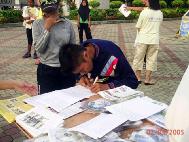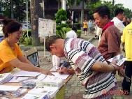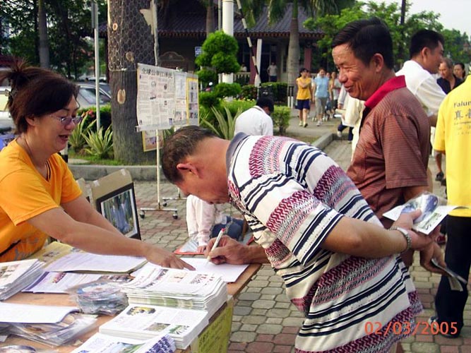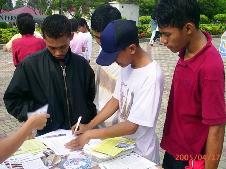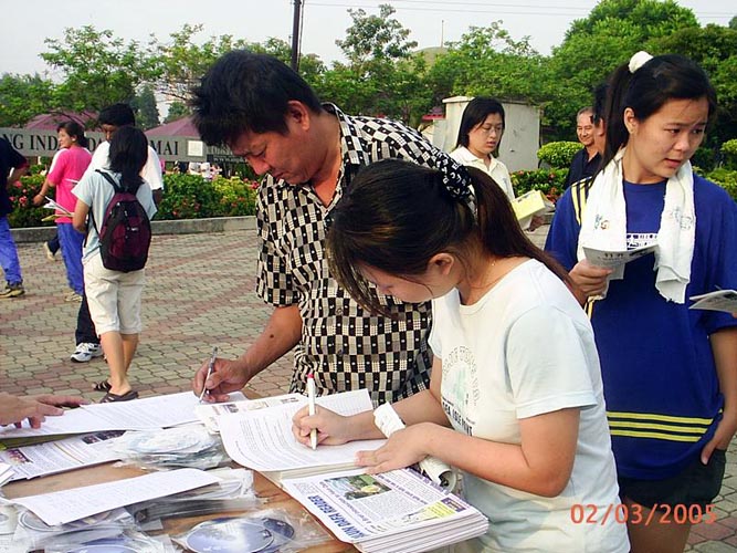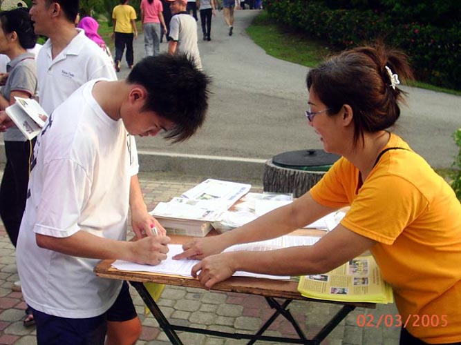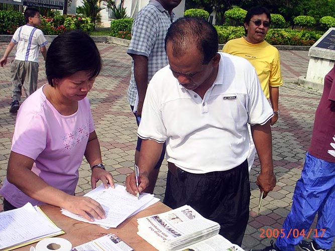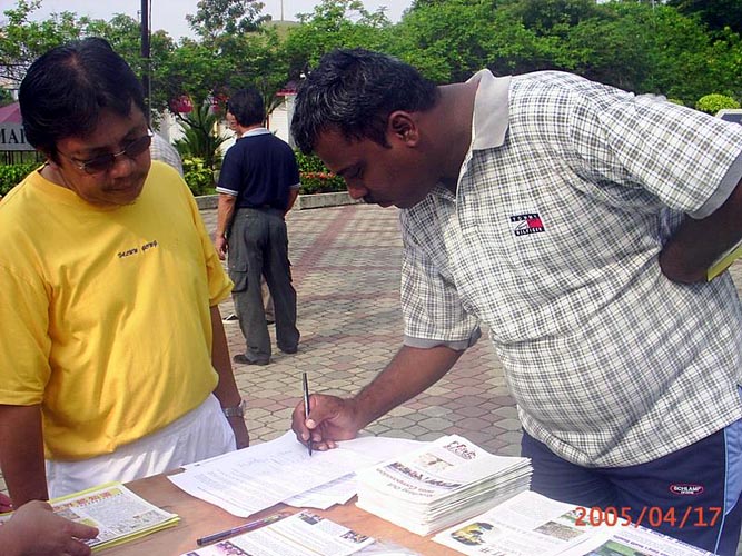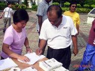前来了解真象的市民现在,越来越多善良的市民,无论男女老少,不分种族、民族,其中包括华人,马来人以及印度人在了解真象之后,纷纷签名支持向国会议员呼吁帮助制止在中国对法轮功的迫害。有两位市民了解法轮功被迫害真象后,不但站在正义一方,还帮助学员向其他市民讲真象。