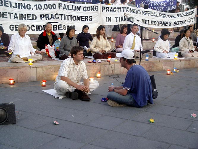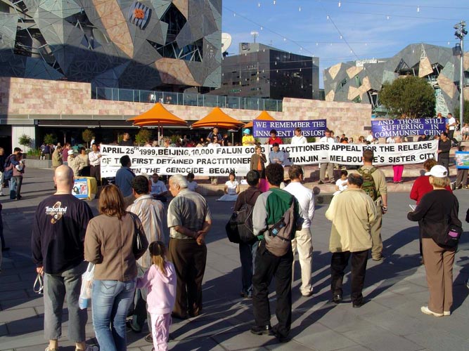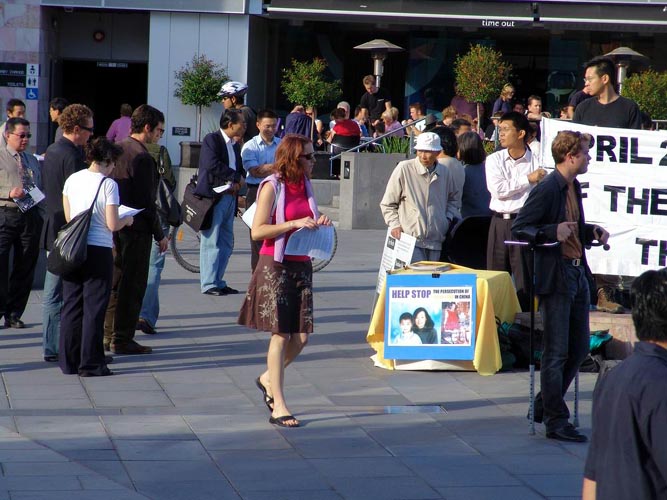 学员卡迪在发言中对墨尔本市民说:今天是“澳纽军团日”,也是上万名中国法轮功学员第一次去中央上访,要求解决天津市抓捕法轮功学员一事的纪念日,而发生此事的天津市正是墨尔本的姐妹城市。我们要让墨尔本人知道,中国的这场对法轮功的大规模镇压就是从墨尔本的姐妹城市—天津市开始的。接着卡迪讲述了“4.25”的经过,及这场持续了六年的对法轮功的残酷镇压。另两位学员也分别讲述了自己的修炼经历及法轮功学员追求真善忍的精神。