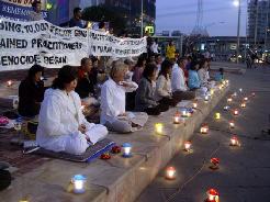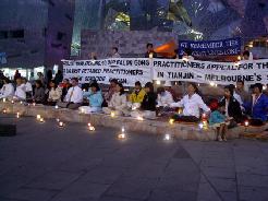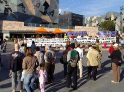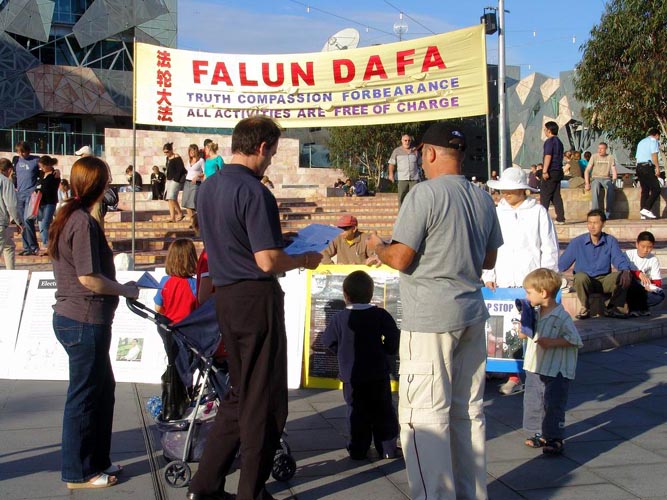法轮功学员们在早上九点到十二点在中领馆发完正念后,来到墨尔本市中心的联邦广场。数十名法轮功学员有的举着横幅静静的站着;有的扶着展板默默的让世人阅读;有的排成一排长时间打坐;有的给过往的行人发资料,同时解答人们的提问。广播里不停的传来“普度”的音乐以及学员的发言,整个场面庄严、肃穆。
