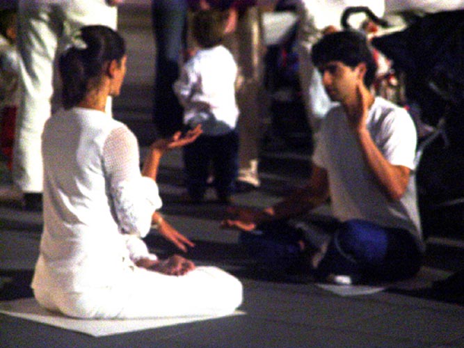 有个越南华人以前从未听说过法轮功,看到这种场面,急于知道实情,当听完学员讲述后表示回家一定上网看看《转法轮》这本书。一位西人男子和学员西蒙交谈了很久,之后一直待在广场上看着学员们发正念,直到结束。还有一位西人小伙子在了解了真象后马上说要看看《转法轮》,学员凯特给他念了“论语”,他说:非常好!并说:我相信我的生命将从今天开始改变。