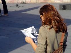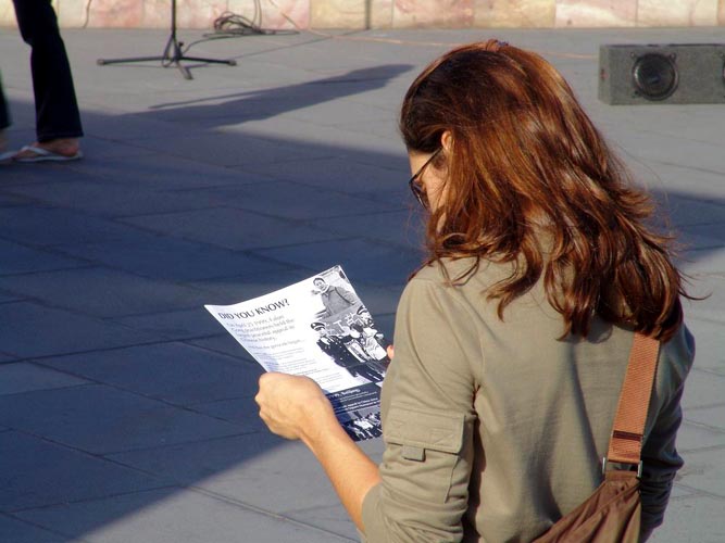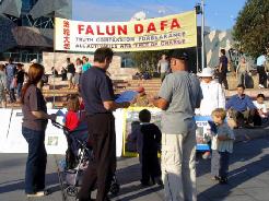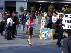 很多路人被法轮功学员的讲述及法轮功的精神打动,有的当场就问:我们能帮什么?学员回答:让你认识的所有的人知道这件事,把法轮功的网址给你的朋友、同事,让他们上网去了解详情。