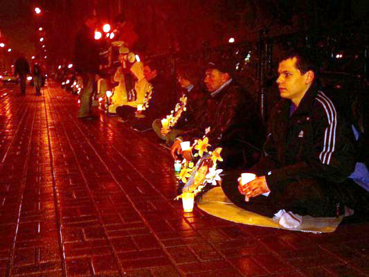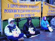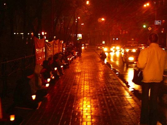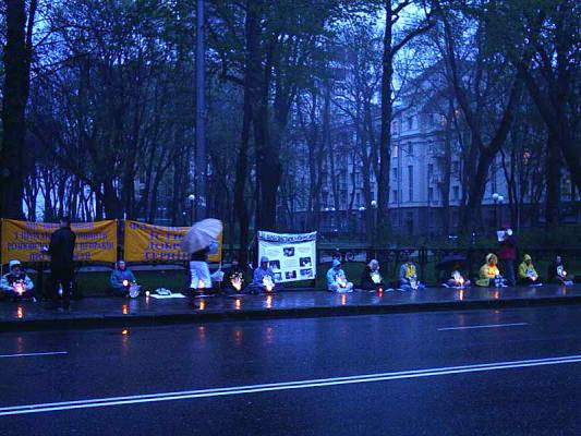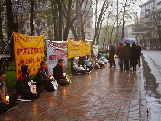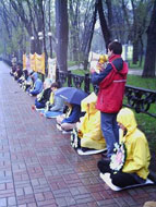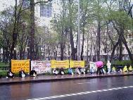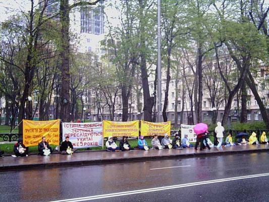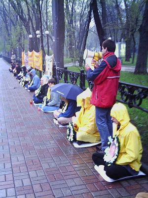 【明慧网2005年4月28日】2005年4月25日,乌克兰法轮功学员在乌克兰基辅市(Kiev)的中使馆前举行了静坐活动,纪念1999年