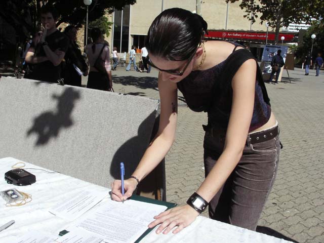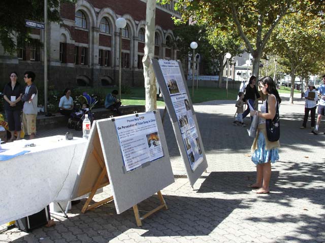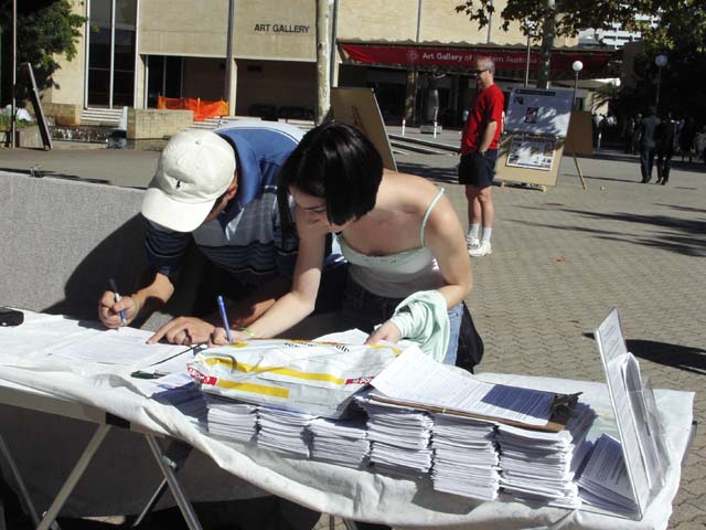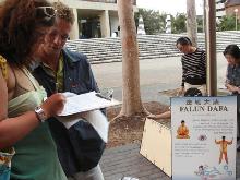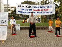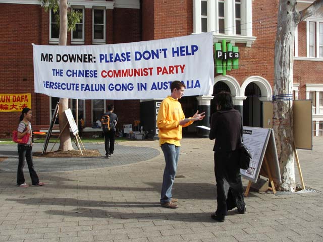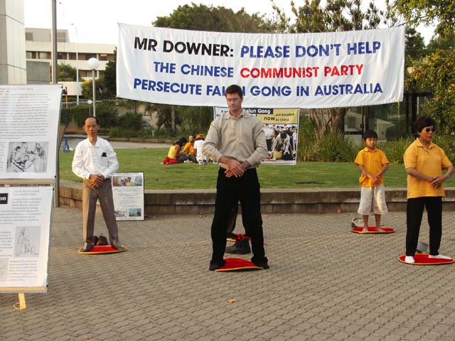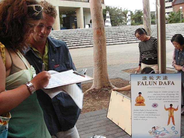 集体炼功,纪念和平请愿六周年该活动在珀斯市中心地带的州立图书馆前举办,法轮功的功法演示和图片展吸引了很多路人的注意,他们十分吃惊如此祥和的功法在中国却遭到如此残酷的镇压,同时也对外交部长唐纳利益重于人权的做法表示鄙视,许多人签名表示支持法轮功学员在堪培拉中领馆前的请愿活动。