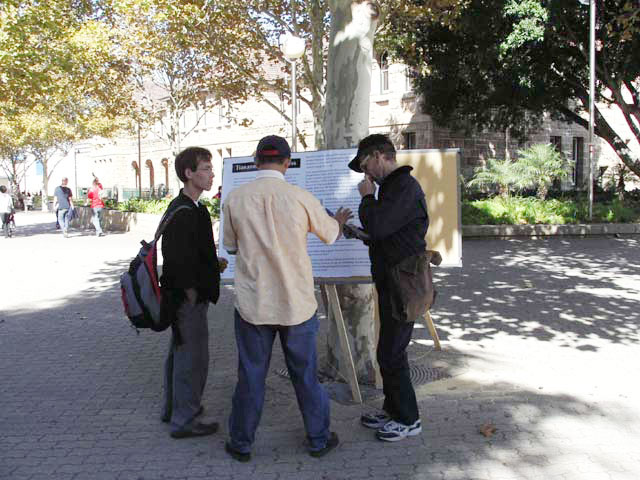 【明慧网2005年4月28日】为了纪念1999年4月25日中国法轮功学员在中南海前的和平请愿活动,2005年4月22-23日,法轮功学员在澳大利亚西部城市珀斯(Perth),举行了两天的“法轮功反图片展”,同时呼吁澳大利亚外交部长唐纳不要继续签发证书限制法轮功学员在堪培拉中领馆前的请愿活动。
