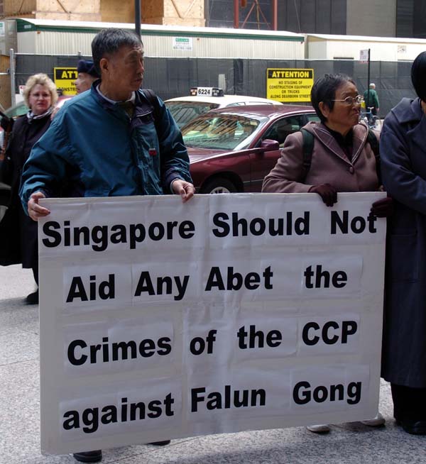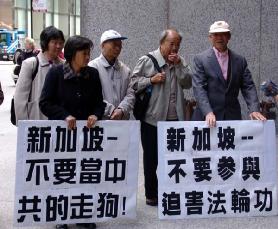 2005年4月28日中午,部份芝加哥法轮功学员28日下午来到新加坡驻芝总领馆前,抗议将新加坡将两名法轮功学员治罪,横幅上写着“新加坡不要当中共的走狗”字样。在中国底层民众积极争取自由,百万民众退!党!的大气候下,新加坡当局的做法实在不合时宜。法轮功的律师TERRY MARSH表示,法律应该是保护人民免遭犯罪袭击,保护言论自由。